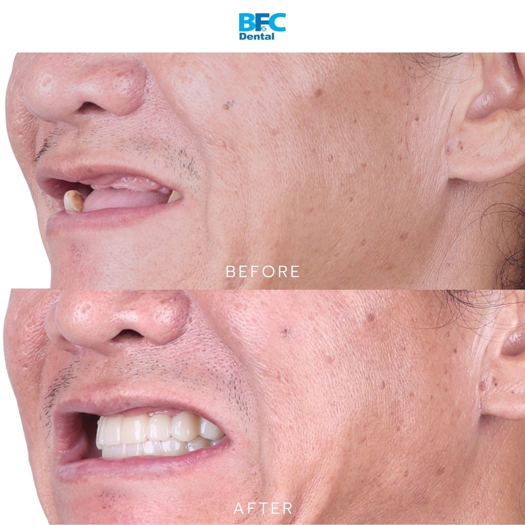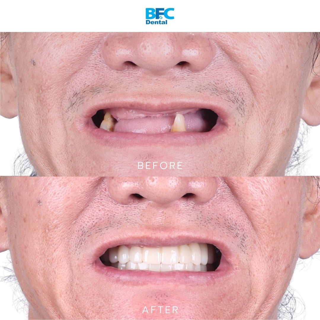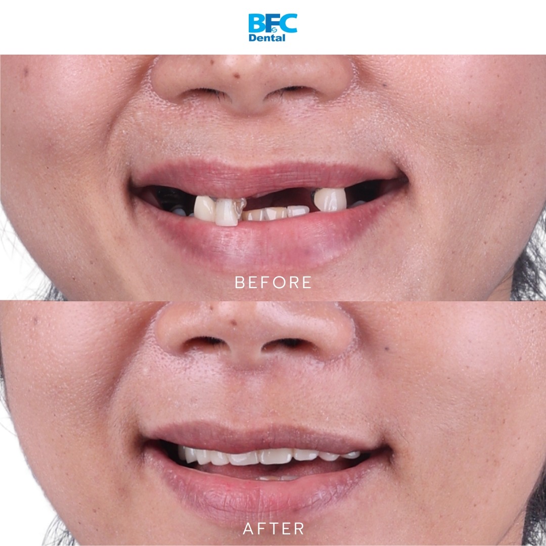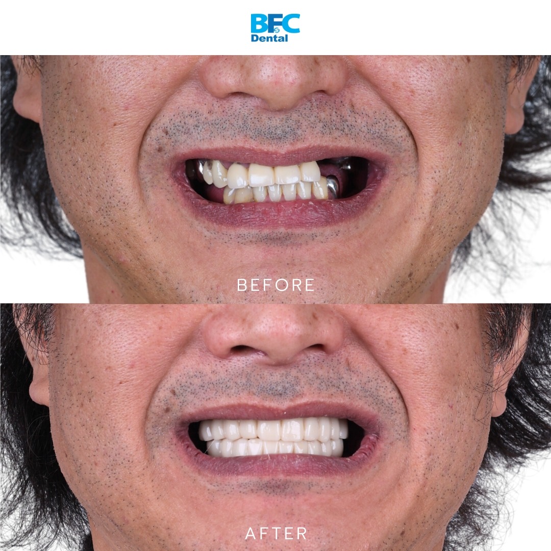หลังฝังรากเทียม ทันตแพทย์จะใส่สะพานฟันชั่วคราวแบบติดแน่นภายใน 1 วัน โดยใช้วัสดุอะคริลิกพรีเมียม (Ivotion®) ที่มีสีและรูปร่างใกล้เคียงฟันธรรมชาติ เพื่อให้ผู้ป่วยสามารถใช้งานได้ในระหว่างรอการยึดติดของรากเทียมกับกระดูก ภายหลังจากฝังรากเทียม 4–6 เดือน ทันตแพทย์จะนัดหมายเพื่อตรวจประเมินความแข็งแรงของรากเทียมและความพร้อมก่อนเปลี่ยนเป็นสะพานฟันตัวจริง วัสดุเซรามิก (Full Zirconia) ซึ่งมีความแข็งแรง ทนทาน โปร่งแสง และให้ความสวยงามใกล้เคียงฟันธรรมชาติ พร้อมรองรับการใช้งานในระยะยาว