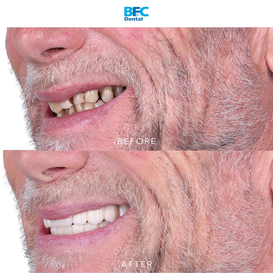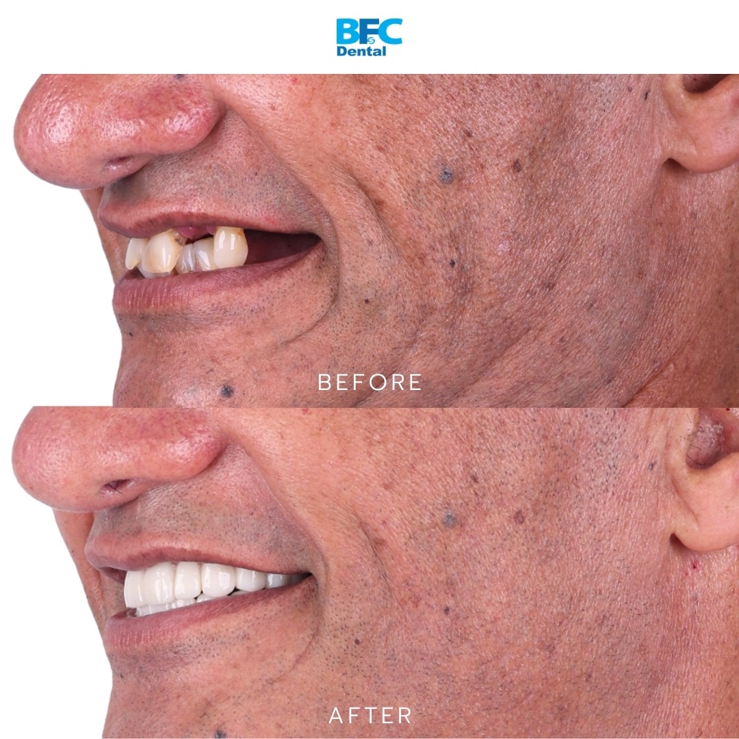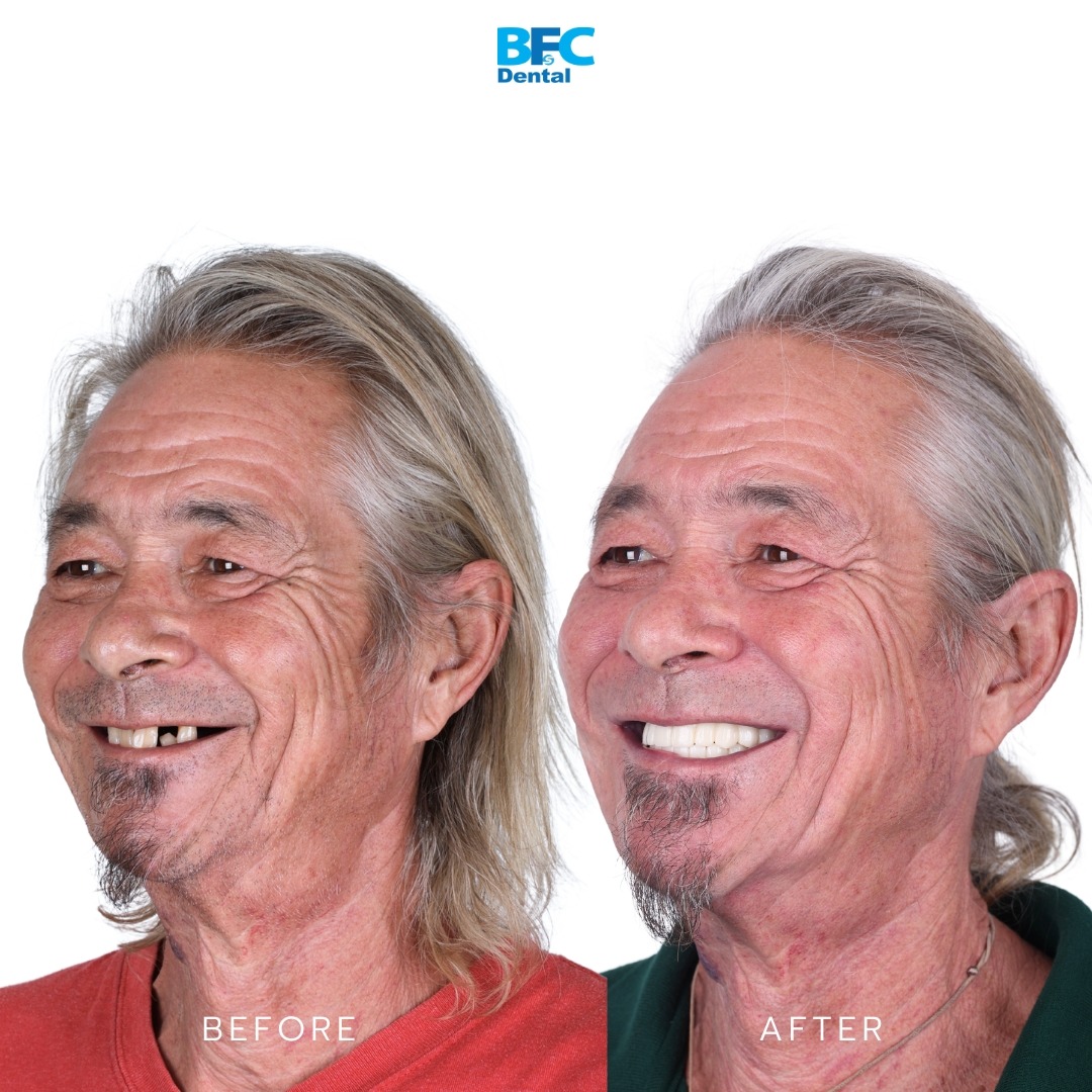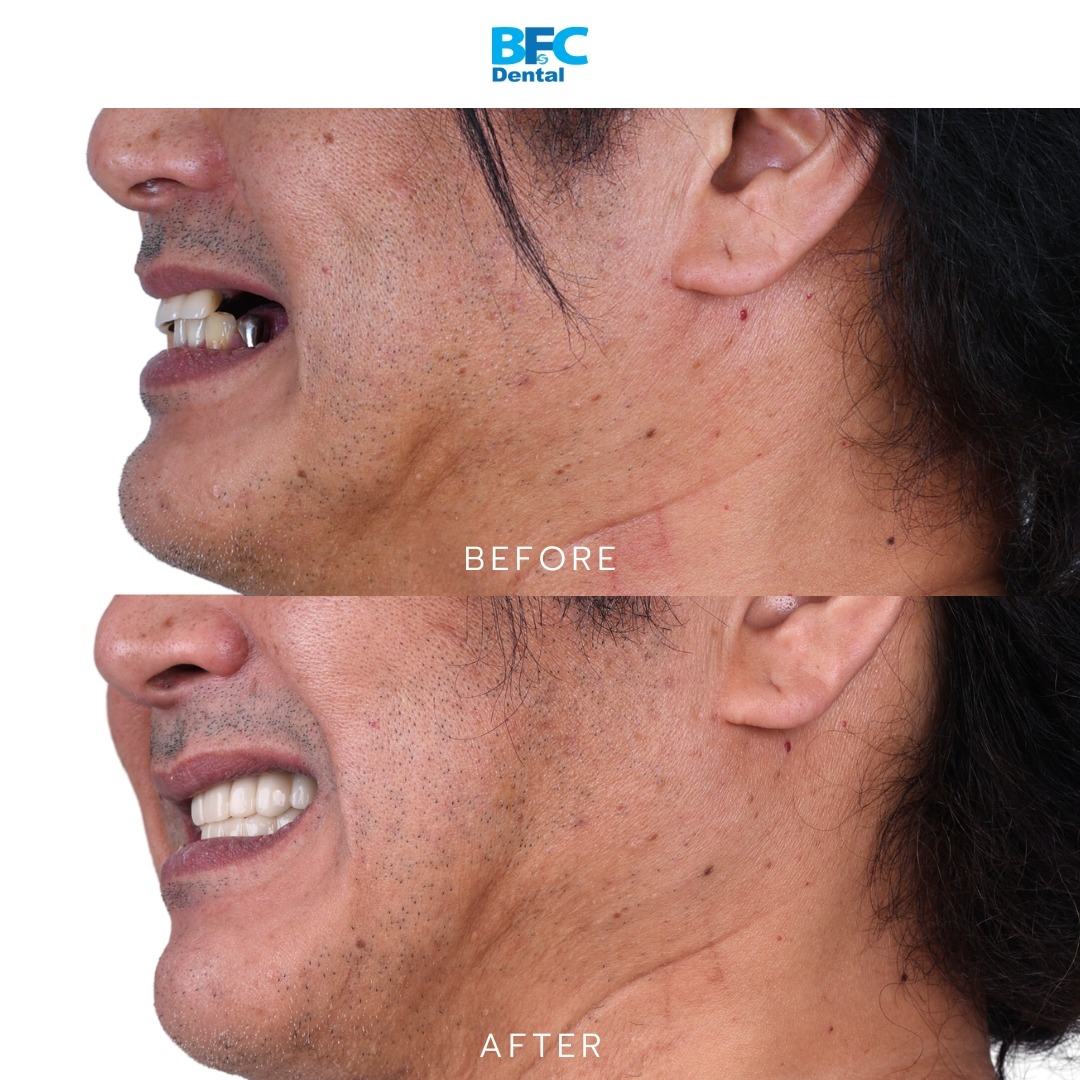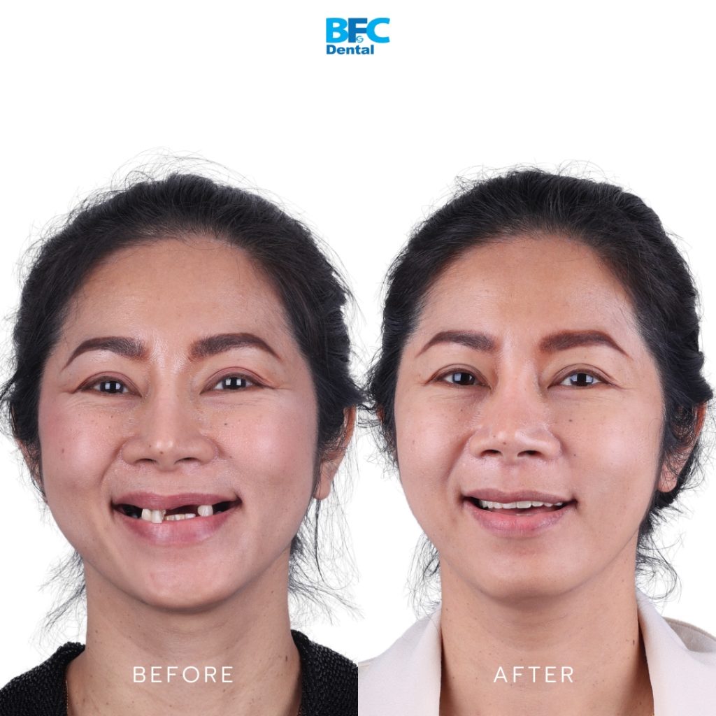 หลังฝังรากเทียม ทันตแพทย์จะใส่สะพานฟันชั่วคราวแบบติดแน่นภายใน 1 วัน โดยใช้วัสดุอะคริลิกพรีเมียม (Ivotion®) ที่มีสีและรูปร่างใกล้เคียงฟันธรรมชาติ เพื่อให้ผู้ป่วยสามารถใช้งานได้ในระหว่างรอการยึดติดของรากเทียมกับกระดูก ภายหลังจากฝังรากเทียม 4–6 เดือน ทันตแพทย์จะนัดหมายเพื่อตรวจประเมินความแข็งแรงของรากเทียมและความพร้อมก่อนเปลี่ยนเป็นสะพานฟันตัวจริง วัสดุเซรามิก (Full Zirconia) ซึ่งมีความแข็งแรง ทนทาน โปร่งแสง และให้ความสวยงามใกล้เคียงฟันธรรมชาติ พร้อมรองรับการใช้งานในระยะยาว